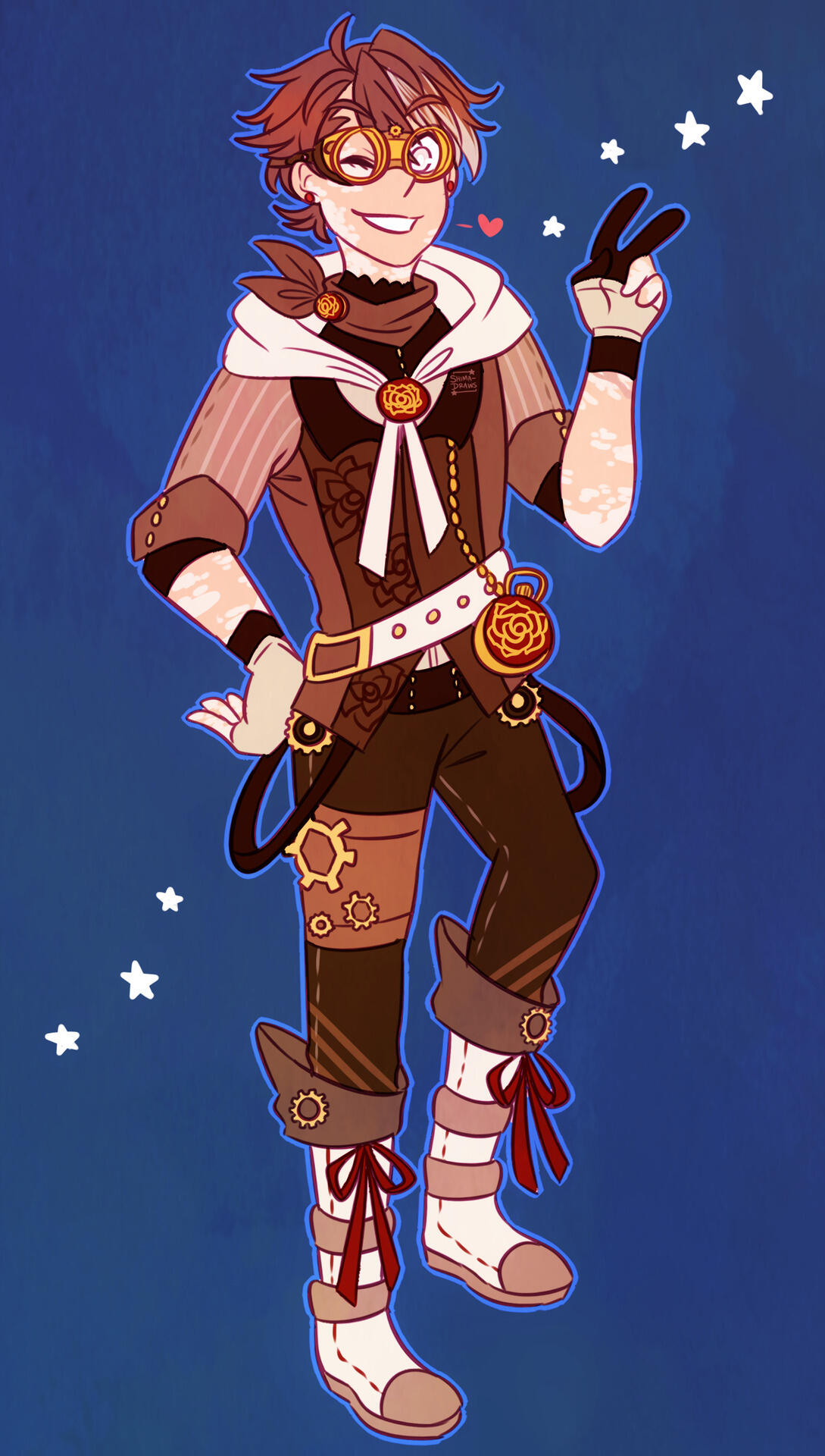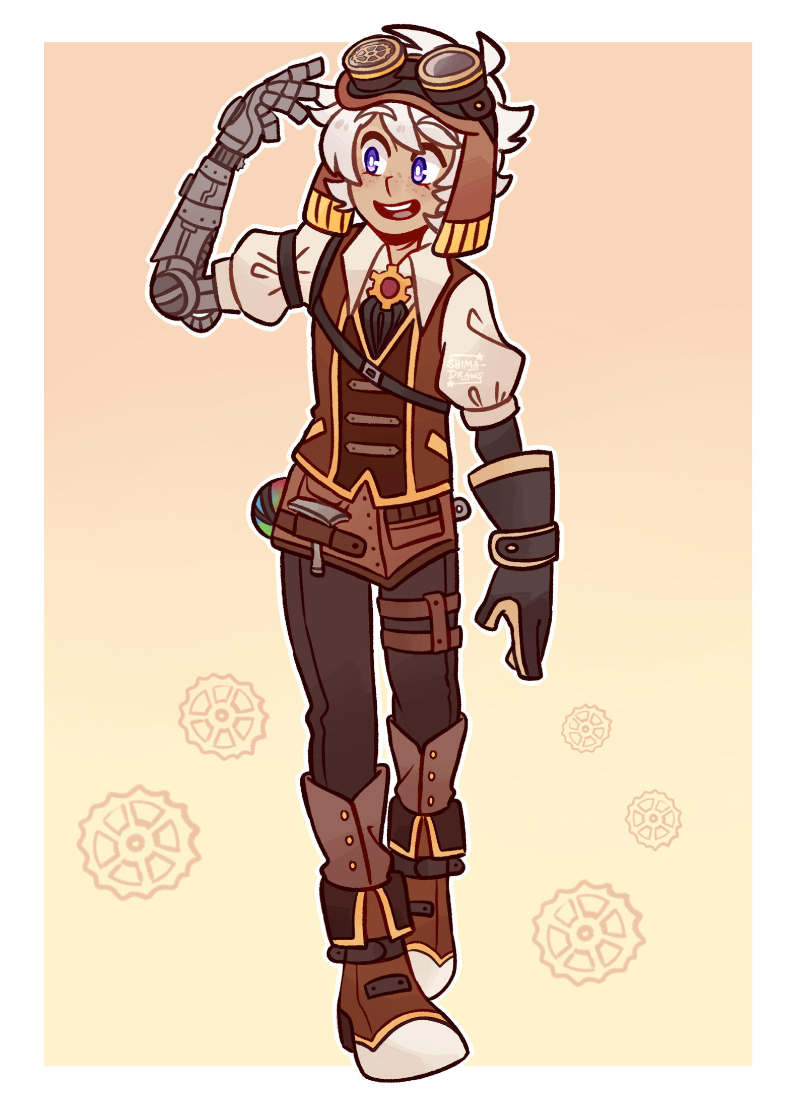 Elias is your friendly neighborhood mechanic, inventor and tinkerer! He’s the go-to guy for fixing anything broken. He has a fascination with robotics and magic engines, and is always seen fiddling with something, either a new invention or his own arm.He was found as a baby and taken into a guild known as Spinelrose. Elias grew up with his caretaker Ignis, who’s also an inventor, so he was surrounded with machinery and engines all the time. He fell in love with tinkering and experimenting, and now he’s the guild’s official mechanic! Elias aspires to be just like the legendary inventor and sorcerer Elymas. Elymas created hundreds if not thousands of inventions back in the day that are still being used now, by combining his talents of inventing and elemental magic (this is a very very hard thing to accomplish). He’s a freaking genius, and Elias adores his work.Elias has to put up with the constant flirting and affections of newcomer guild member Gifre–and it isn’t easy, since Gifre is a charmer! But eventually they do become very close, and Elias ends up getting caught in a confrontation from the underground crime organization Gifre secretly works for–Python’s Blood. In the process Elias loses his arm and discovers that he’s an invention created by Elymas. So…it’s an inbetween sort of thing, and a bit hard to explain, but he functions just like a human and acts like a human, so nobody was ever able to tell the difference. Python’s Blood wants to take a sample of Elias and use it to create their own artificial humans, so they cut off his arm as the sample, and that’s how he loses his arm.Later on, Gifre goes on a journey of self-discovery after breaking ties with Python’s Blood, leaving Elias alone. During his year away Elias creates a robot called Gifre-bot, Gi-bot for short. Eventually Gi-bot begins to sense Elias’ attachment to him and realizes it stems from his feelings for Gifre, so he tries to act upon these feelings (basically he surprise kisses Elias!) Elias lets him for the first couple seconds but then he totally flips out. (Keep in mind, Gi-bot is a fully functioning AI who is sentient and can make his own decisions outside of his core programming! So he can feel human emotions like love and jealousy and all that. Also, Elias isn’t entirely human either–remember he was created by Elymas. So we have like…two-half robots here.) Elias explains to him the whole thing between him and Gifre, and he thanks Gi-bot for trying to fill the gap inside him that Gifre’s absence left. They don’t get into a relationship of course, though they would be capable of that–Gi-bot just becomes an extremely close friend that Elias can rely on. (They cuddle together a lot, Gi-bot has an internal heating system so he’s always really warm.)At the very end of his story arc, Elias creates another robot called Eli-bot for Gi-bot to be with. After a crazy adventure in another world known as the Mirrorplane, Elias and Gifre start dating and they live together at the guild, working on inventions and having a merry life together.
