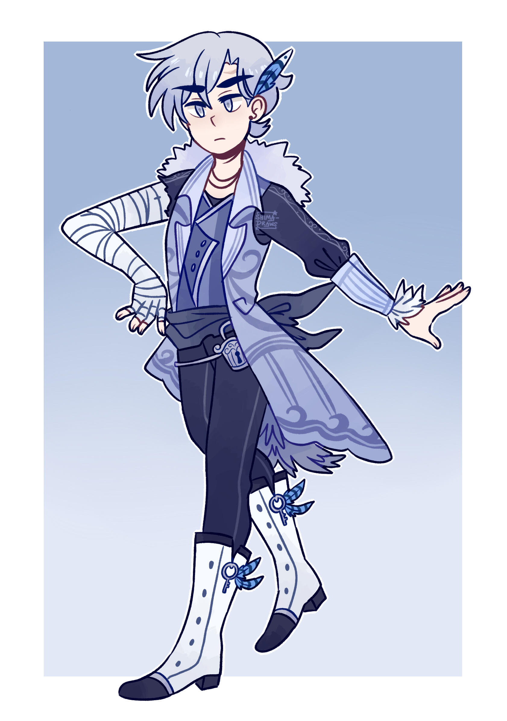 Emrys is from the Mirrorplane, the parallel world to ATS. His kingdom is caught in a huge power struggle between all the other kingdoms, and Emrys’ mother, a queen who only seeks power from others, is leading them straight into ruin. Emrys is destined to receive the Crest of the Crowned, which is basically a huge emblem of power, as soon as he’s officially crowned as the king. Except that the queen plans to utilize the emblem’s power to start a grand war, which. Is not good!! The night Emrys finds this out, he plans to escape the kingdom along with his childhood best friend Lixin, a regular human who’s basically being used as a pawn to be married off to Emrys’ younger sister in order to create powerful elemental children. Yikes! Emrys is also engaged to a princess from another kingdom, but it’s an arranged marriage, and he doesn’t have feelings for her (so there’s another good reason for him to leave). Lixin is caught during his escape, and Emrys leaps to his rescue, but in the scuffle things get tense and he accidentally kills the guards sent after them. Hands stained with blood, Emrys stumbles into a portal leading to the other side of the Mirrorplane.Emrys decides that he might as well stay there since he doesn’t know how to get home and he probably shouldn’t go home–he’ll be safer here, and this way his mother can’t use him to start a war. This goes alright for a couple months as he adapts to a world that isn’t constantly fighting with each other, until he realizes that his mother somehow sent people to come look for him and capture him so he can be dragged back home. He also hears word that Lixin is in this world as well. Emrys goes on the run, never sticking around one place for long, and tries to search for Lixin along the way. This is when he meets Lacie!If it weren’t obvious by now Emrys is a loner and therefore hates guilds and being associated with them. So naturally, after running into Lacie, he treats her with a lot of attitude and snark, which she retaliates against. After Lacie helps him chase off a couple thugs that he stole stolen goods back from (not the people actually chasing him), she somehow coerces him into the guild for a couple days, and he’s unsettled yet warmed by the friendly atmosphere. Emrys eventually admits he has to stick around town for a while to make some money, so Lacie offers to help him out by going out on official guild missions. Emrys is like I don’t need or want your help and she’s like alright fine then try making money on your own, guild missions pay WAY better and you can’t do one without an official member escort. So he’s like. Jesus fine okay I’ll go on the damn mission with you LOLThey go on a couple missions together and start getting close. Emrys is like oh no this is not what I want so he panics and tries to leave town, but Lacie catches up to him and yells him for leaving without saying anything. Unfortunately during this whole mess the trackers sent to follow Emrys find out where he’s hiding. He and Lacie go out on one last goodbye mission together and they get ambushed. They’re horribly outnumbered and even when Emrys resorts to actually fighting his hardest, Lacie gets terribly injured. Emrys manages to fight off the attackers, getting his hair cut off shorter in the process (which is why it’s shorter and in a cute little half bun in the second pic), but Lacie’s losing so much blood at this point–so he stumbles into the closest building in the closest town and GUESS WHO’S IT IS.YEAH. IT’S THE ROBO FAM!! (Take note that this is like, 2-3 years after they return from the Mirrorplane themselves, so they’re around 25 at this point.)Elias and Gifre are enjoying a nice evening prosthetic check date when Emrys stumbles into the mechanic shop, covered in Lacie’s blood, and begs for help before passing out. Both of them go OH SHIT and immediately leap to the rescue. As Elias, Gi-bot, Ava and Ignis (who were called in) work on patching up Lacie’s wounds, Elias realizes that her arm is too far gone to be saved. And this is kind of a sad moment for him since you know. He also lost his arm. So he can relate. Ava’s like you’ll just have to make her the best goddamn prosthetic in the world then and he’s like alright yeah, so they have to remove Lacie’s left arm and it’s. Not pretty.Emrys wakes up several hours later to find that Gifre treated his wounds. When he asks where Lacie is and Gifre shows him, he immediately breaks down, because she got hurt SO badly because of him and this is why he didn’t want to get close to her in the first place. He laments over dragging her into his mess, and Gifre gives him a nice long Pep Talk, coming from a similar situation with dragging Elias into his personal issues with Python’s Blood. It helps a little, but Gifre can tell Em’s gonna be blaming himself for this for a WHILE (hence the guilt complex comment).As Lacie recovers and gets used to her new prosthetic (and keeps smacking Emrys whenever he looks guilty about it), the two of them become closer despite Emrys’ attempts not to–but Lacie is stubborn and refuses to let him distance himself. They also get really close and bond a lot with the robo fam, having bunked with them for a while. The main part of the story is just these domesticity moments with the robo fam and their two new dysfunctional houseguests LOLEventually Emrys does find Lixin and decides to return to the Mirrorplane to sort things out with his mother, and that brings up a whole bunch of crazy drama, but the robo fam and Lacie come with him (and by that point he’s gone Full Tender and leans on them a lot for support so it’s NICE and CHARACTER DEVELOPMENT), so things get sorted out one way or another. There is a point where he and Lacie have a huge fight because Lacie…finds out something about the Mirrorplane that she does not like, and it nearly shatters her entire relationship with Em, so that’s a big oo