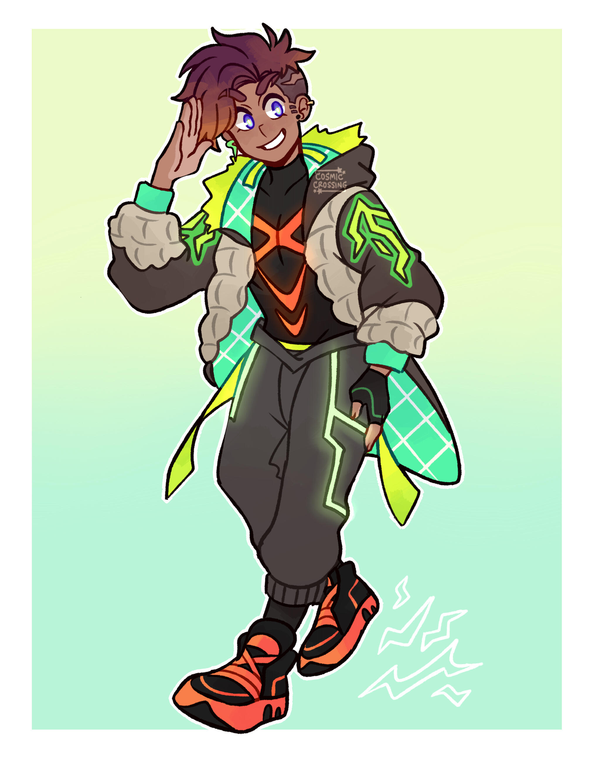 Meet Gifre! He’s a space elemental capable of shapeshifting, but the only thing he can change is his right hand. He usually transforms his fingers into giant claws that he uses to slash enemies. He can also portal jump in order to escape from any sticky situations he gets himself into. He actually works for an underground crime organization known as Python’s Blood and was ordered to infiltrate Spinelrose (but that plan horribly backfires when he starts crushing hard on Elias lolol).He goes through several changes in his story arc, from hunting down members of Python’s Blood during his year away from home, to traversing a parallel world known as the Mirrorplane to rescue Elias and ends up becoming horribly injured–so much so that he loses the ability to speak. Thankfully Elias crafts him a special machine that attaches to his throat that connects directly to his brain, allowing his thoughts to be projected through it!