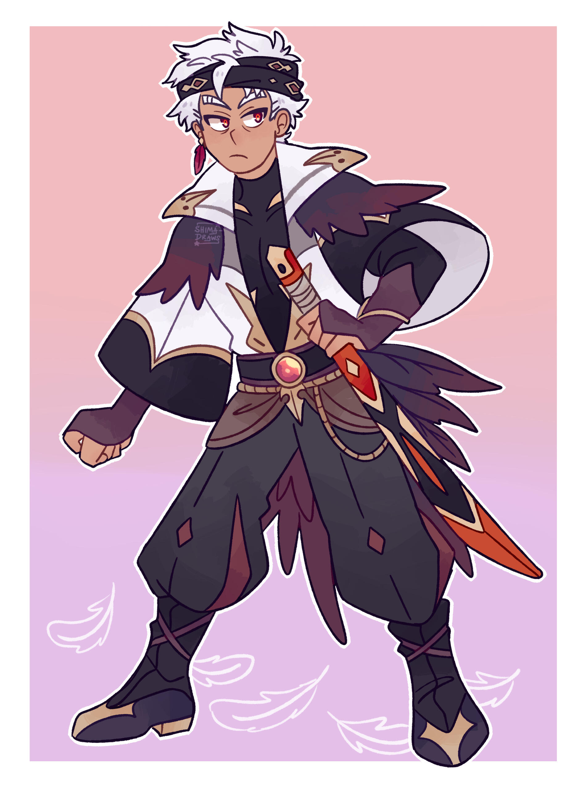 Meet Gifre! He’s a space elemental capable of shapeshifting, but the only thing he can change is his right hand. He usually transforms his fingers into giant claws that he uses to slash enemies. He can also portal jump in order to escape from any sticky situations he gets himself into. He actually works for an underground crime organization known as Python’s Blood and was ordered to infiltrate Spinelrose (but that plan horribly backfires when he starts crushing hard on Elias lolol).He goes through several changes in his story arc, from hunting down members of Python’s Blood during his year away from home, to traversing a parallel world known as the Mirrorplane to rescue Elias and ends up becoming horribly injured–so much so that he loses the ability to speak. Thankfully Elias crafts him a special machine that attaches to his throat that connects directly to his brain, allowing his thoughts to be projected through it!