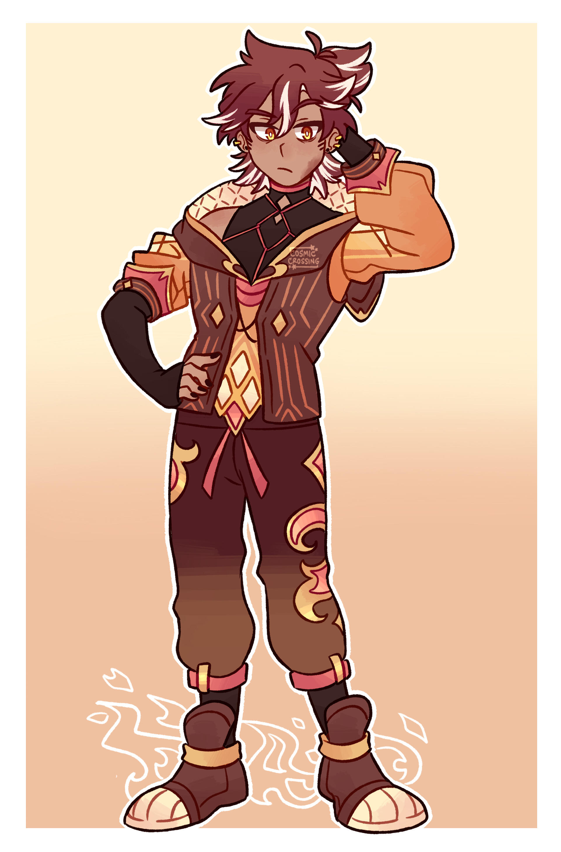Kiyo, the Guildmaster of the Asterstone Guild! He only took up the position recently and has had the Guildmaster title for about a year and a half. He was the previous record holder for youngest Guildmaster until that title was stolen by Taku. (Kiyo holds a grudge about it but it’s playful.)Kiyo, just like lots of other characters in ATS, was taken in by the Asterstone Guild at a young age. He’s similar to Shima in that he has no previous memories before showing up outside the guild one day, battered and bruised. (That marks three characters in this series with amnesia now! Wrow) He grew up under the watchful eye and tutelage of the previous Guildmaster, and because of how attached to him she’d gotten, it wasn’t long before he began to express desires to take over the guild once she retired. After a lot of thought and contemplation she eventually handed over the position to him. This initially resulted in a lot of outrage from the guild members because they did not think Kiyo was suited to be the Guildmaster, but he eventually proved them wrong once he stepped up to the plate and showed them he could act like a true leader!They did have good reason to be nervous about that, though, as Kiyo is normally a very laid-back and carefree person and is strictly non-violent. This has lead into lots of situations where he’s opted out of fighting, leading his guildmates into lots of trouble when they needed a hand, and they labeled him as both a coward for avoiding necessary battles on missions (which is practically a requirement for a guild member going out on dangerous quests, you sort of have to have a battle prowess to take on any foes) and lazy for not participating when he should. Initially this bothered Kiyo a great deal, but the previous guildmaster assured him that not everybody is suited for battling others, and that he can still pave his own way to success in a non-violent manner. While Kiyo may not have a liking for fighting, he has an extremely smooth tongue and is very capable of talking himself out of sticky situations (mostly by bribing. He is VERY good at that lmao). He has a talent for manipulating others into doing what he wants them to, though he rarely uses this on people he considers friends. When Kiyo’s able to complete a mission and win the day without resorting to using their elemental powers in a fight, his guild members have to stop and think for a second like. Hold on. He just did that so easily, he made it look so simple, we really need to stop underestimating him and calling him totally useless (Kiyo: Hey. HEY).Kiyo’s pretty close to all of his guildmates despite their constant ribbing—the one person he’s close to that adores him completely is Lacie, because he was the person to bring her into the guild (she was around 10, he was 17), and being the first person to genuinely show her kindness that wasn’t for ulterior motives, Lacie became very attached to him. Kiyo acts like an older brother to her, and Lacie supports him in whatever he does. She was thrilled when he took on the Guildmaster position, and he has a very soft spot for her :’) She always sings his praises to anybody outside who will listen, and gets angry at Emrys the one time he called Kiyo incompetent.After becoming the guildmaster, Kiyo actually does a good job at taking charge despite the general opinions that he wouldn’t. He’s still very casual about it though and is a bit more flexible with how the guild is run, preferring to let the guild members do things their own way and be less strict about the overall rules. He’s basically got the “Do whatever you want!” and “Just wing it!” outlook, and while a lot of the members don’t like this attitude, a lot of them do. At the end of the day they all do respect him, though! While he isn’t a fighter he’s very good at giving orders and keeping things in check around Asterstone lolDespite Kiyo’s insistence on staying out of battles, he’s actually an extremely skilled fighter, and is probably the strongest and most dangerous person in the entire guild. The issue with this, though, is that whenever he gets into a fight, he tends to get too “serious” and starts going off the walls, treating the battle as a game and something fun and entertaining. This leads into him not knowing when to stop, and nobody else being able to stop him, so he’s seriously injured other people without meaning to—revealing that he’s actually terrified of violence because he loses himself in it, and why he prefers to stay on the sidelines. It’s only when Kiyo gets really serious in battles that a darker side comes out, and where the star mark in his eye appears. It’s only been seen a few rare times throughout his life at the guild, so nobody really thinks much of it or notices it. It’s only after the star mark appears that Kiyo passes out afterwards, having exerted a lot of power and extremely skilled battle prowess nobody has ever seen before. However, after a grand guild tournament where Kiyo faces off against Taku and gets too into it, revealing his star mark and almost slicing Taku’s head clean off, one of Kiyo’s advisors at the guild starts to look into it out of concern for both Kiyo’s safety and that of others.In the middle of all this mess, Kiyo meets Toru, and after nearly forcing him to join Asterstone, the two start growing closer 👀 Toru joins the squad of not putting up with Kiyo’s bullshit, but that’s only after he gets over his starstruck fanboy phase. Because Toru is newer to the guild and because he’s a non-elemental not suited for fighting, Kiyo instantly becomes attached to him, finding similarities in their preferences and backgrounds. While Toru does think Kiyo’s an idiot sometimes he treats him very kindly, and is usually the first to defend him when the other members playfully tease him, so Kiyo’s just like you are an angel sent from heaven just for me and I adore you. Still though with Tor